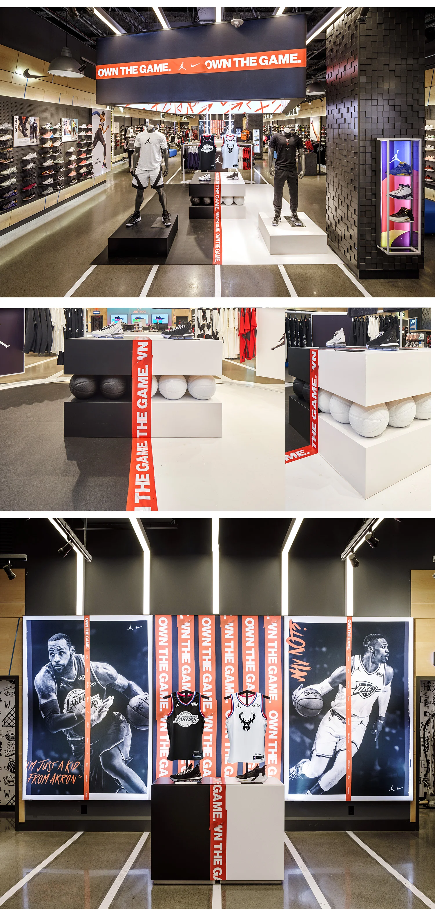 One of my favorite parts about leading the Jordan account for HERENOW was when we had the opportunity to collaborate with Finish Line. For this project, we were asked to come up with a retail environment for the 2019 NBA All-Star Game. We were given an idea of the look and feel of the campaign by the Jordan Brand design team and got to work. I created sketches, designed some preliminary ideas in SketchUp, and presented to the 3D team to render the space below. Our agency oversaw the production and installation of all elements, this consisted of a large halo graphic, 2 initiative zones (custom pedestals, floor mats, and mannequin platforms), lightboxes, and store signage.